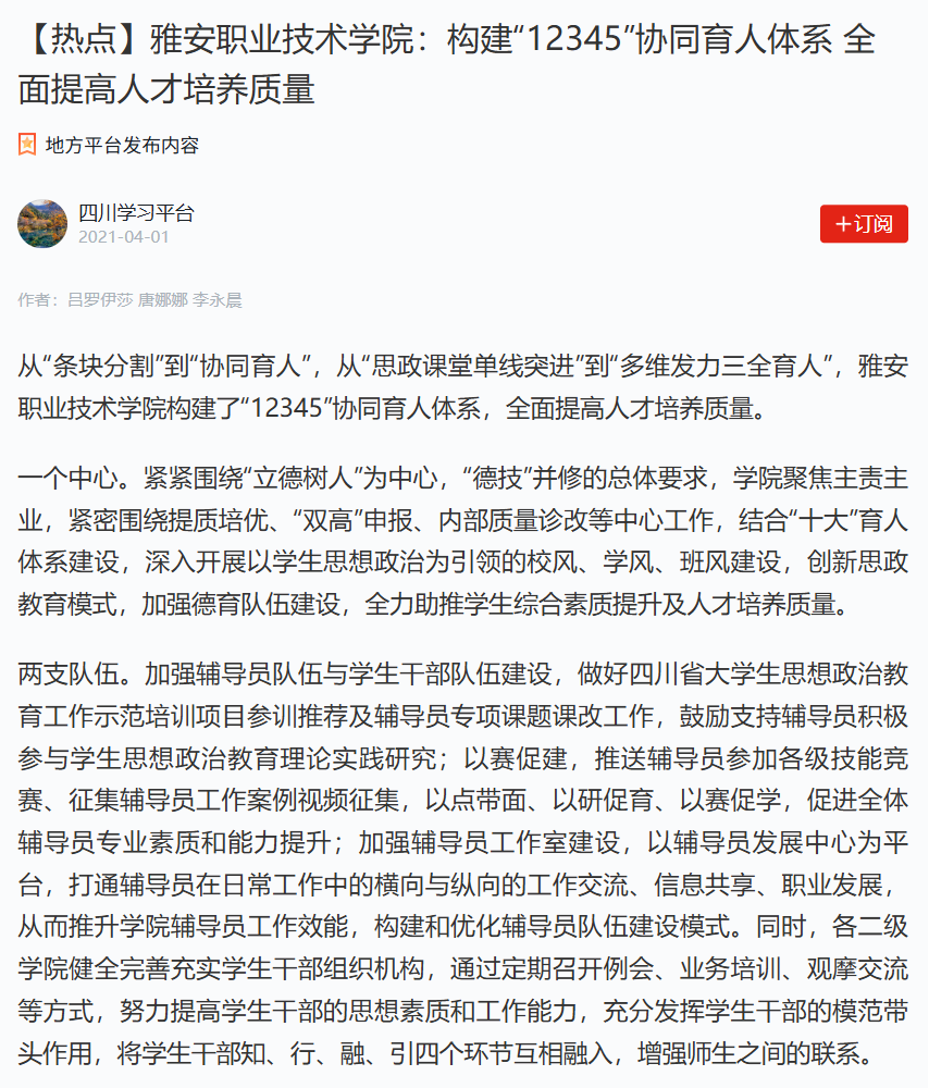 雅安职业技术学院:构建“12345”协同育人体系 全面提高人才培育质量