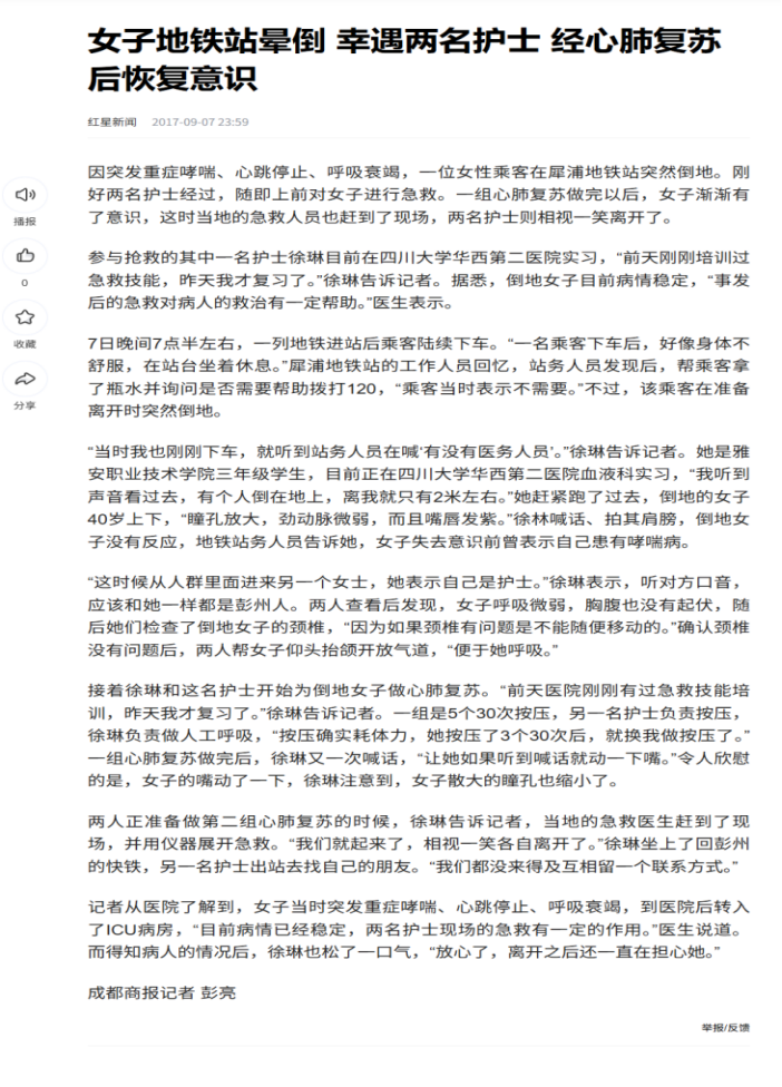 女子地铁站晕倒 幸遇两名护士 经心肺复苏后恢复意识