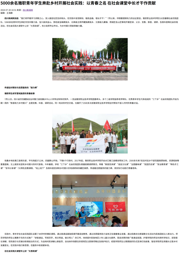 5000余名雅职青年学生奔赴乡村开展社会实践:以青春之名 在社会课堂中长才干作贡献