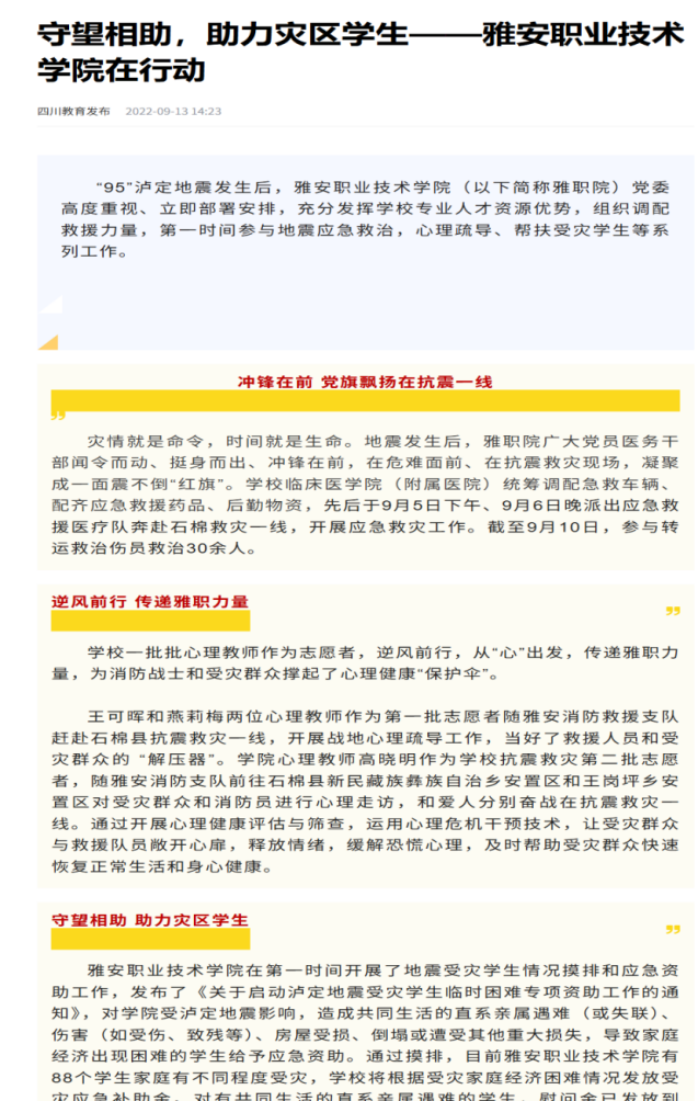 守望相助,助力灾区学生-雅安职业技术学院在行动