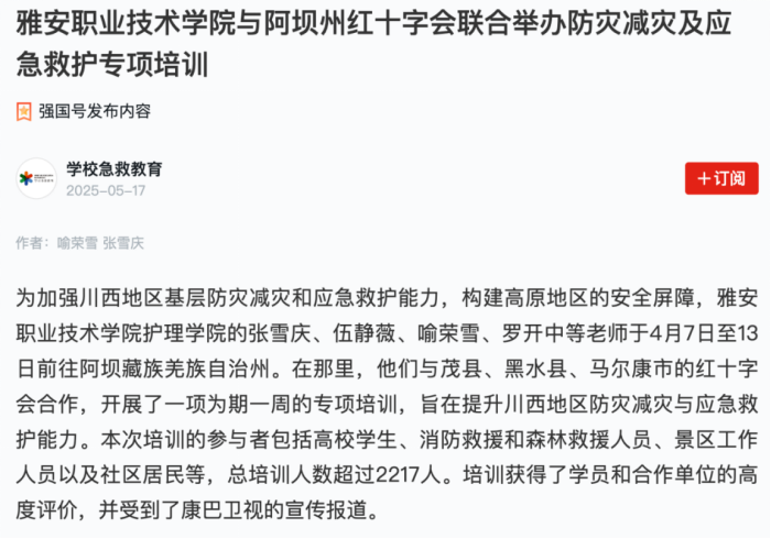 雅安职业技术学院与阿坝州红十字会联合举办防灾减灾及应急救护专项培训