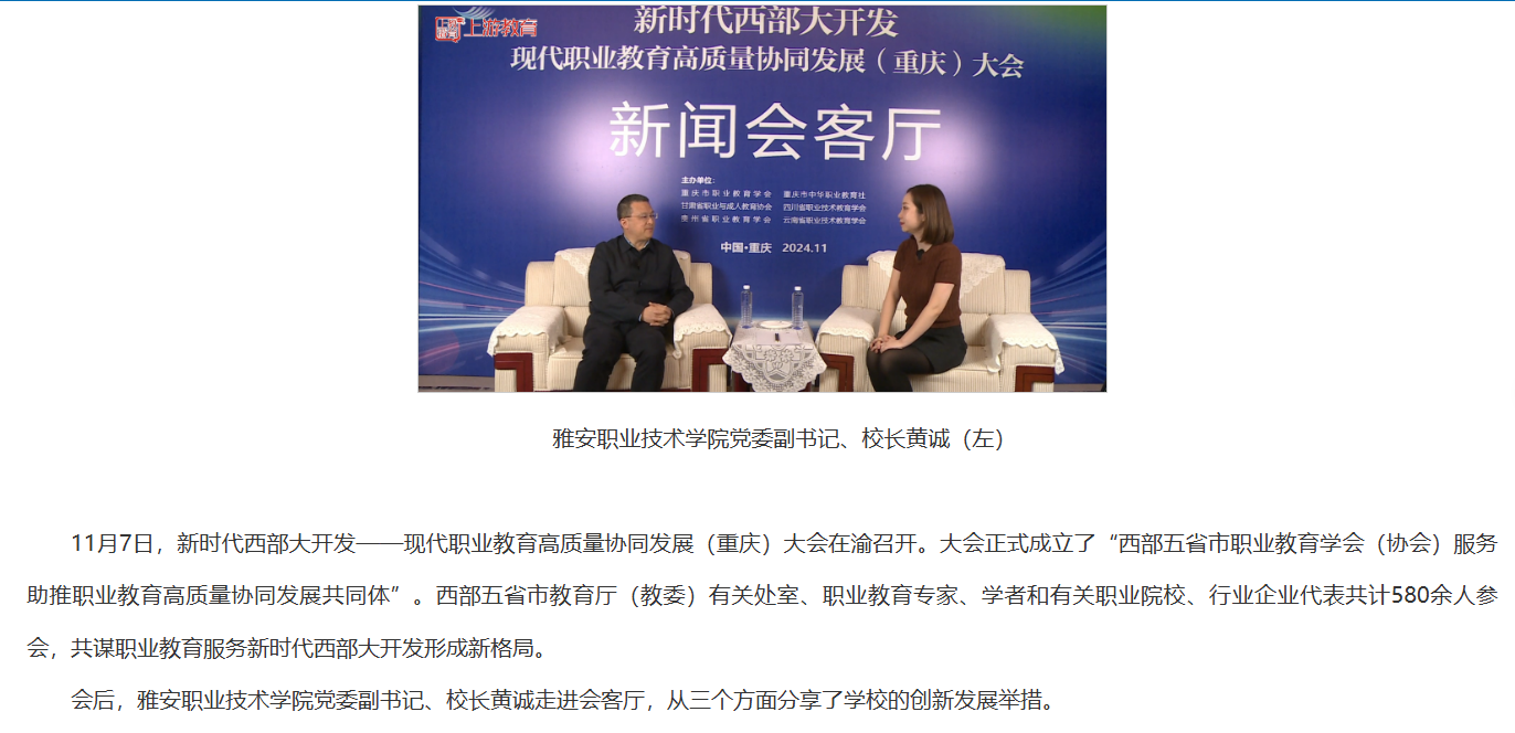 《西部职教大会17丨雅安职业技术学院党委副书记、校长黄诚:融入地方产业、围绕地方经济,助推学校高质量发展》