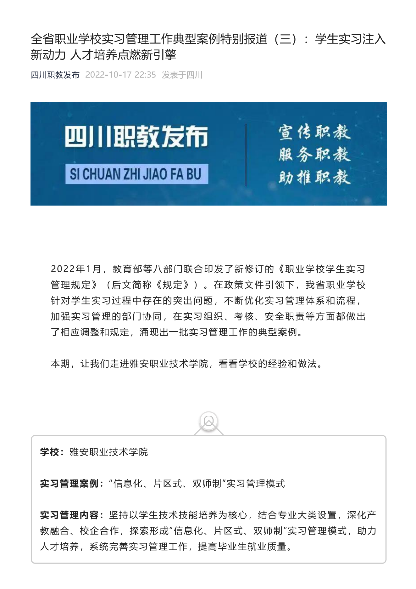 《全省职业学校实习管理工作典型案例特别报道(三):学生实习注入新动力人才培养点燃新引擎》